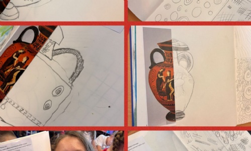 In Art this week, the children have been practising different line drawing techniques. They have used their new skills to complete an Ancient Greek vase drawing, showcasing cross-hatching, one directional and curved lines, as well as circular lines.