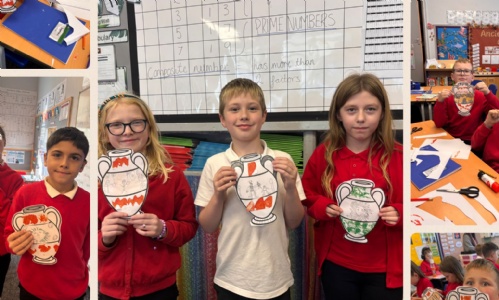 Through studying real examples of Ancient Greek pottery, they also designed a central image for their vase, inspired by themes and stories from Ancient Greece. The results were truly impressive — each child produced a unique and creative piece of art that showcased both their printing skills and their historical understanding.
